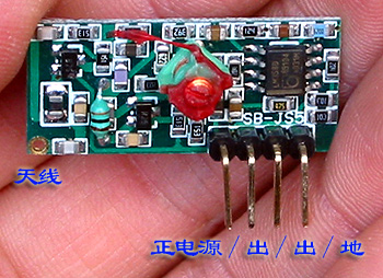 DF接收模块的工作电压为5伏,静态电流4毫安,它为超再生接收电路,接收灵敏度为-105dbm,接收天线最好为25~30厘米的导线,最好能竖立起来。接收模块本身不带解码集成电路,因此接收电路仅是一种组件,只有应用在具体电路中进行二次开发才能发挥应有的作用,这种设计有很多优点,它可以和各种解码电路或者单片机配合,设计电路灵活方便。