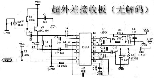 从外接天线接收的信号经C8耦合到L3、C9组成的选频网络进行阻抗变换后输入RX3310的内部高频放大器输入端14脚,经芯片内的高频放大后(增益为15~20DB)的信号再经混频器与本机振荡信号(316.8M)混频,产生1.8M的中频信号,此中频信号经内部中频放大后由第3脚输出,再进入比较器放大整形,最后数据从第8脚输出。