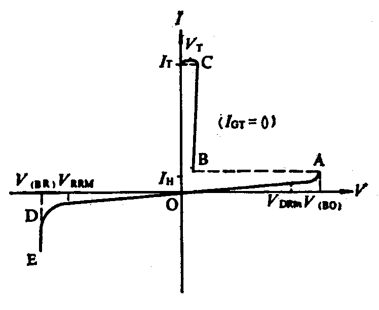 晶闸管的伏安特性如图1所示。测正向特性时,阳极A接电源正极,阴极K接电源负极,仅有很小的漏电流,由于门极未加触发信号,IGT=0,故晶闸管关断,对应于曲线上OA一段。当正向电压达到并超过直流转折电压V(BO)时,晶闸管被正向击穿,进入负阻区,对应于虚线AB;最后达到低阻区BC,通态电流IT迅速增大,晶闸管导通。IH是维持电流,它表示让晶闸管处于导通状态所需最小电流。